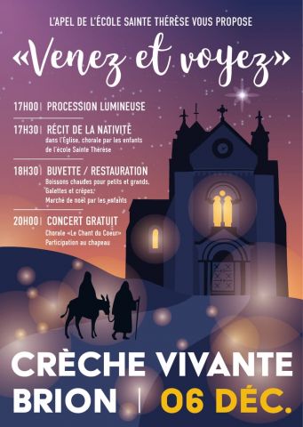 L'association des parents d'élèves de l'école Sainte Thérèse organise une crèche vivant le samedi 6 décembre dans le centre de Brion. Au programme : procession lumineuse, conte de la nativité, restauration et concert.