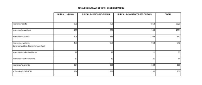 A l’issue du premier tour des élections municipales le 15 mars dernier, la liste « Continuons ensemble », portée par Monsieur Sandro Gendron a été élue. Il n’y aura donc pas de second tour aux Bois d’Anjou le 22 mars 2026.